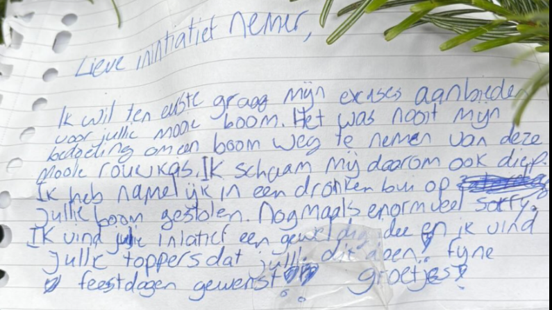 Kerstboomdief in Groningen krijgt berouw: boom keert terug met excuses.
